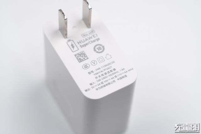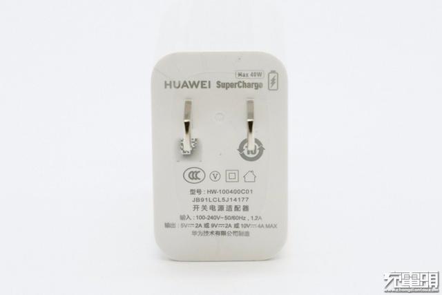 Mate20 Pro搭载40W超级快充,充电器不可折叠插脚设计,型号HW-100400C01,支持100-240V 50/60Hz 1.2A全球电网,带有5V2A / 9V2A / 10V4A三个电压输出档。