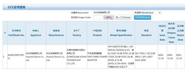 华为135W充电器证书编号2020010907359172,生产厂商为东莞市奥海科技股份有限公司,发证日期2020-12-30,从功率上可以看到这是一枚输出功率达135W的充电器。