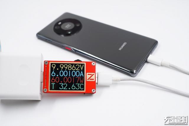 使用原装66W充电器搭配原装数据线为华为Mate40 Pro充电,功率为9.99V 6.00A 60.00W,此时处于11V 6A的快充状态。