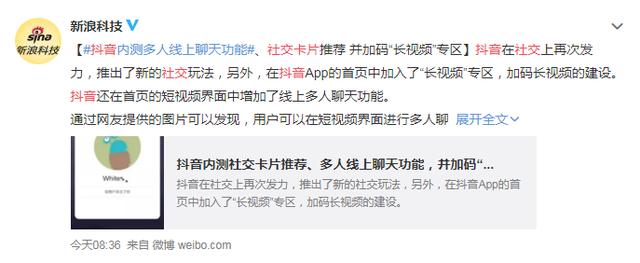 据报道,抖音正在内测社交卡片、短视频多人线上聊天等功能。