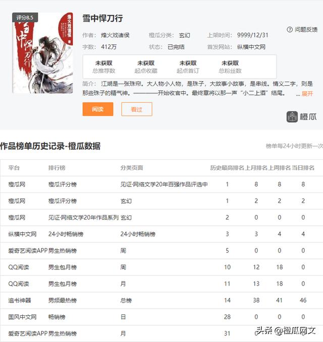 《雪中悍刀行》不愧为烽火戏诸侯的代表作,其各项成绩都让人惊艳,不论是在纵横中文网、爱艺奇阅读APP,还是QQ阅读等,其成绩都处于领先地位。