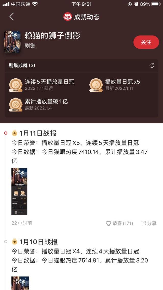 《赖猫的狮子倒影》播出后成绩亮眼,首播就成为平台的热播榜冠军,随着剧情的播出热度也持续走高,全网热搜125个,更是连续5天拿下网络播放量第一的成绩。