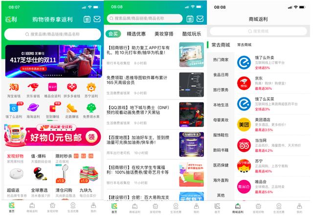 【生活优惠】栏中基本上就是搜罗了各大不同平台放出来的优惠,比如领红包、领优惠券等等,非常适用于日常爱薅羊毛的用户,这个tab同样也是贴合返利网的核心业务,通过源源不断的“返利网专属优惠”吸引和圈住用户群。用户在这个平台上获利越多,自然而然就更加频繁地有事没事上来平台逛下,看看有什么潜在的优惠适合自己,然后再进一步得到获利,形成一个习惯性的循环。