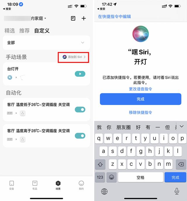 接下来返回场景,将这一操作添加到 Siri,并为它设定一个指令。这样,你不仅可以用 Siri 语音开关,也可以在《快捷指令》app 中点击操作。