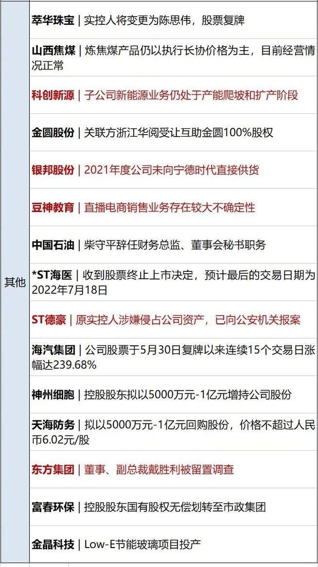 NO.7东方集团(SH600811,股价2.92元,市值106.8亿元):6月20日公告,公司董事、副总裁戴胜利先生因涉嫌私分国有资产罪、受贿罪被立案调查并实施留置措施,相关事项尚待进一步调查。