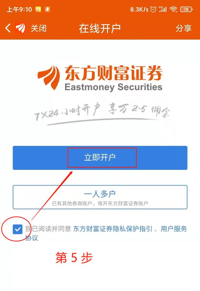 05进入后,先点选“小方框”(在“我已阅读并同意东方财富隐私保护指引、用户服务协议”之前),之后点击“立即开户”;