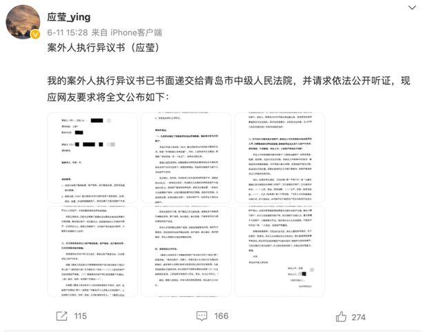 应莹对媒体表示,6月13日,青岛中院已经签收了执行异议书。