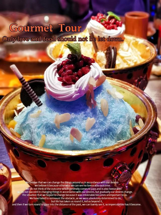 雪花冰的颜值那是杠杠的!水蓝色的细腻绵冰搭配上红豆,奶油还有杏仁片,口感清清爽爽,冰冰凉凉,特别适合火锅后搭配,清新舒爽