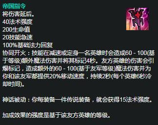 帝国指令,是一件神话装备,神话被动可以提高沙皇的法术强度。帝国指令2700金币的神话装备能提供法强、生命值、技能急速、基础法力回复的四种属性,性价比非常高!而被动【协同开火】我们分成两部分看,首先看第一部分——是对于沙皇自身在使用减速技能攻击目标时能造成60-100的额外伤害,而且这个被动是没有CD的,意味着沙兵的每下平A都附带额外伤害,造成的额外收益远远超过装备自身的价格,这很像法师版''魔切'',也是黑科技的核心所在!我们再看第二部分——被沙皇减速的目标都能挂上一个印记,队友攻击此目标时能触发印记造成60-100的额外伤害,且沙皇和队友此时能获得持续两秒20%的移速加成,更好的在后续黏住目标。