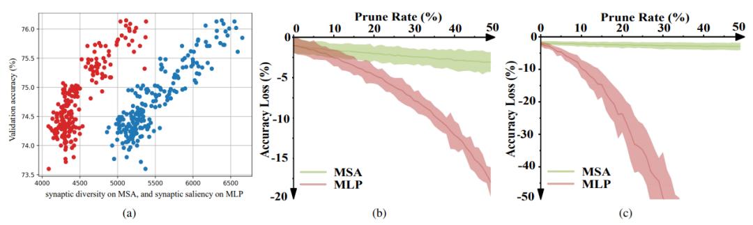 图 3. (a)MSA 的突触多样性(红)以及 MLP 的突触显著性(蓝)的评估效果;(b-c)MSA 和 MLP 具有不同的剪枝敏感性。