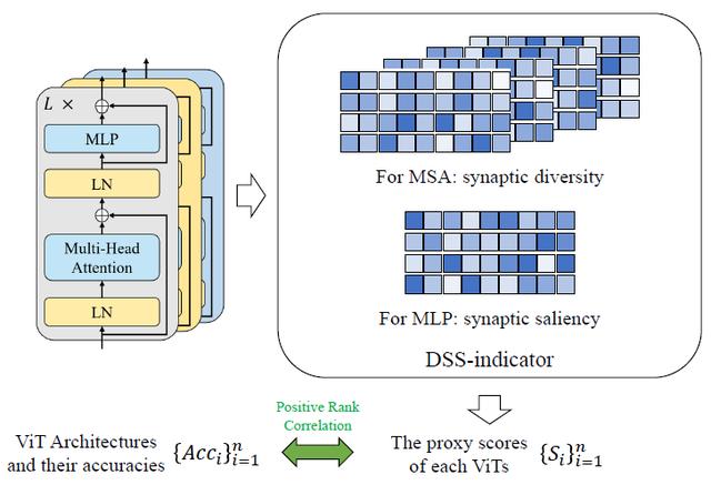基于上述分析,研究者设计了一种基于模块化策略的无需训练的 TAS(TF-TAS),来提高搜索 TAS 的搜索效率。如下公式所示,DSS-indicator 同时考虑 MSA 的突触多样性和 MLP 的突触显著性来对模型进行评分: