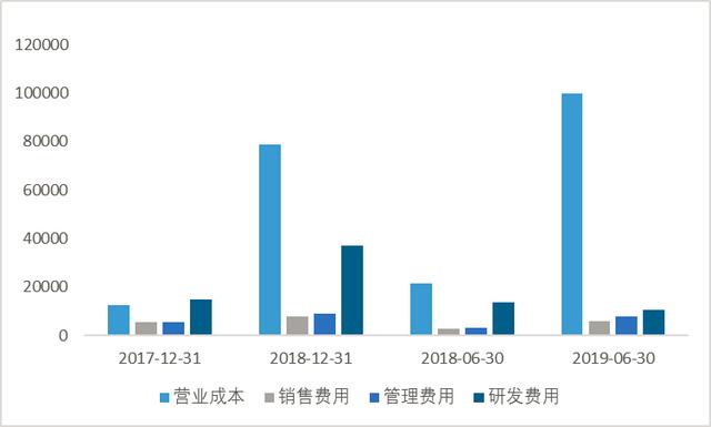 营业成本方面,据财报数据显示,2017年、2018年和2019年1-6月,达闼科技营业成本分别为1.24亿元、7.86亿元、9.96亿元,占营业收入的比重分别为99.05%、94.72%和97.71%。可见,达闼科技的营业成本持续大幅增加,仅2019年上半年营业成本就已经超过2018年全年值;2017年以来,公司营业成本占营业收入比重一直在90%以上,盈利空间被严重压缩。