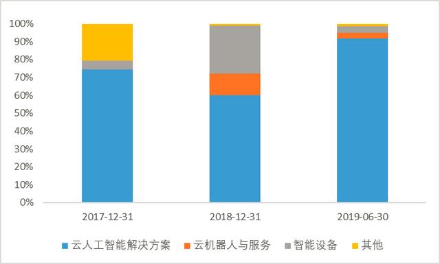 从财报中可以看出,公司的营业收入主要来自于云人工智能解决方案,而非其所谓的云机器人与服务。2017年、2018年公司来自云人工智能解决方案的收入分别为0.93、4.98亿元,占营收比重分别为91%和59%;而云机器人与服务业务收入分别为16万人民币和1亿元人民币,占营业收入的比重分别为0.1%和12.1%。2019年1-6月,公司云人工智能解决方案收入为9.35亿元人民币,同比增长340.9%,占比增加至91.64%,几乎贡献了公司全部的收入增长;而云机器人与服务收入占比再度降至3.2%的个位数水平。