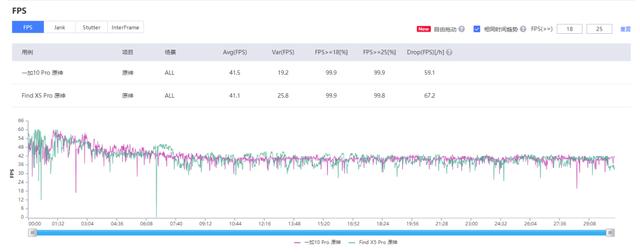 两台手机画质全开玩原神,半小时下来平均帧率只相差了 0.4 帧,这种差距可以说是非常小,几乎可以忽略不计,而且它们的帧率波动也是出奇一致: