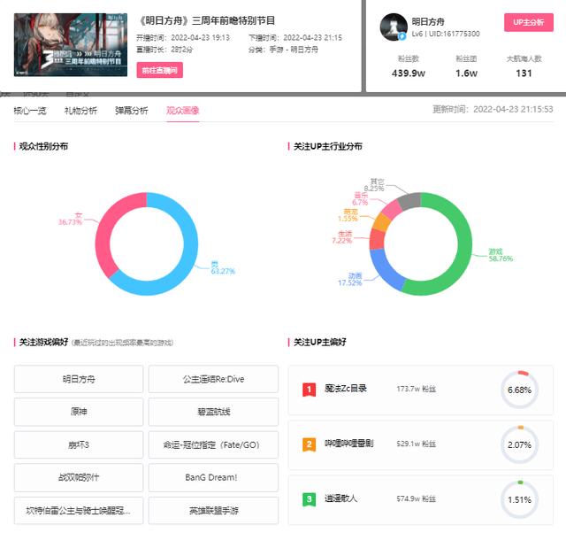 5. 点击观众画像,可以了解到观众性别分布、关注UP主行业分布、关注偏好。