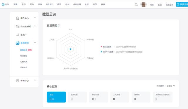 打开哔哩哔哩官方平台,进入官网点击头像找到直播中心点击查看,可以直接查看UP主的直播数据情况,包含直播收益 、直播时长、新增粉丝、人气峰值、弹幕数、累计有效观看时长。