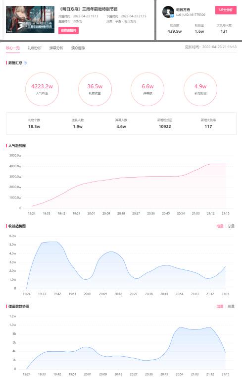 2. 通过点击分析,可查看直播数据详情,包含人气峰值、礼物收益、弹幕数、新增粉丝等,能够直观的看到UP主直播间的对应数据维度变化包括直播人气趋势、收益趋势、弹幕数趋势。
