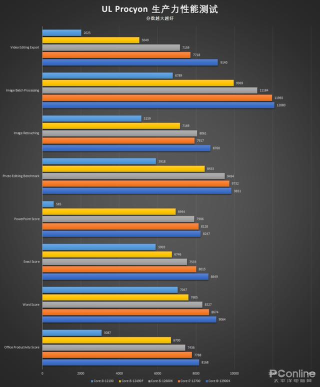 细心的网友或者会发现,为何i3-12100在OFFICE上的性能得分较低呢?其实在UL Procyon基准测试里,i3-12100在Word与Excel小项中的得分并不算差,也就说明处理器性能并不会比i5-12490F差太远,在日常使用中只会是小幅落后。而OFFICE PPT测试项目中,可看到每个小项里显卡性能的占比比较重,i5-12490F平台配的是RTX 3050显卡,而i3-12100仅是用核心UHD Graphics 730,因此i3-12100在PPT测试中分数表现较差些,这里也建议大家若是预算足够,入门级平台配个独显也是必须的。