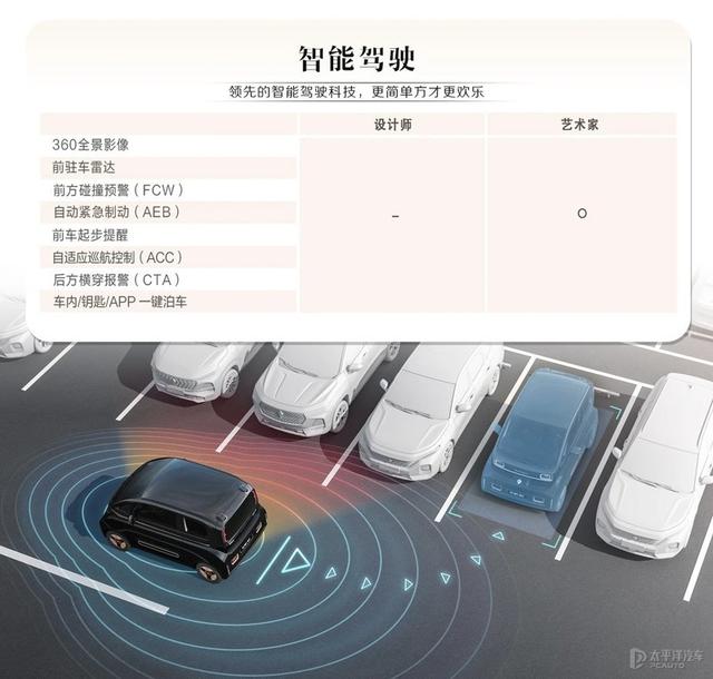 智能配置方面,KiWi EV全系标配BAOJUN车联网2.0版本,带有OTA远程升级技术,以及丰富的远程车控功能。此外,在艺术家车型上,还可选装“智能驾驶包”,选装后将提供ACC自适应巡航、一键泊车、360全景影像等功能。