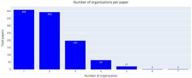 大多数论文有 1 或 2 个组织,但有些论文的撰写有 7 个组织的参与。
