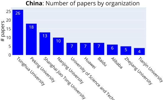 美国在工业和学术领域都有多个机构组织,并且有大量的论文。而英国发表情况基本由 DeepMind 主导,其次是一些大学。