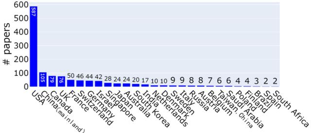 需要注意的是,国家或地区是根据组织机构的总部所在地而定,而非论文作者所在位置。因此,如果一位论文作者在 Google 苏黎世工作,那么该论文被计入美国,而不是瑞士。