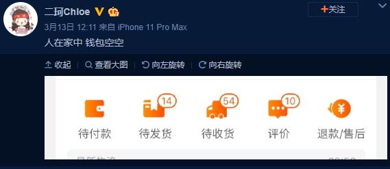 二珂在微博中晒出了自己的淘宝后台,表示自己“人在家中,钱包空空”。