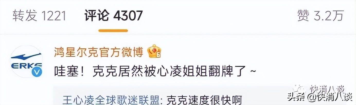 有人认为,以王心凌的国民度和“翻红”后的吸金能力,如果能与老牌国货鸿星尔克合作,应该属于“强强联合”,或许能再次引起鸿星尔克“野性消费”,毕竟“心凌男孩”追起星来可是直接下手芒果股份。