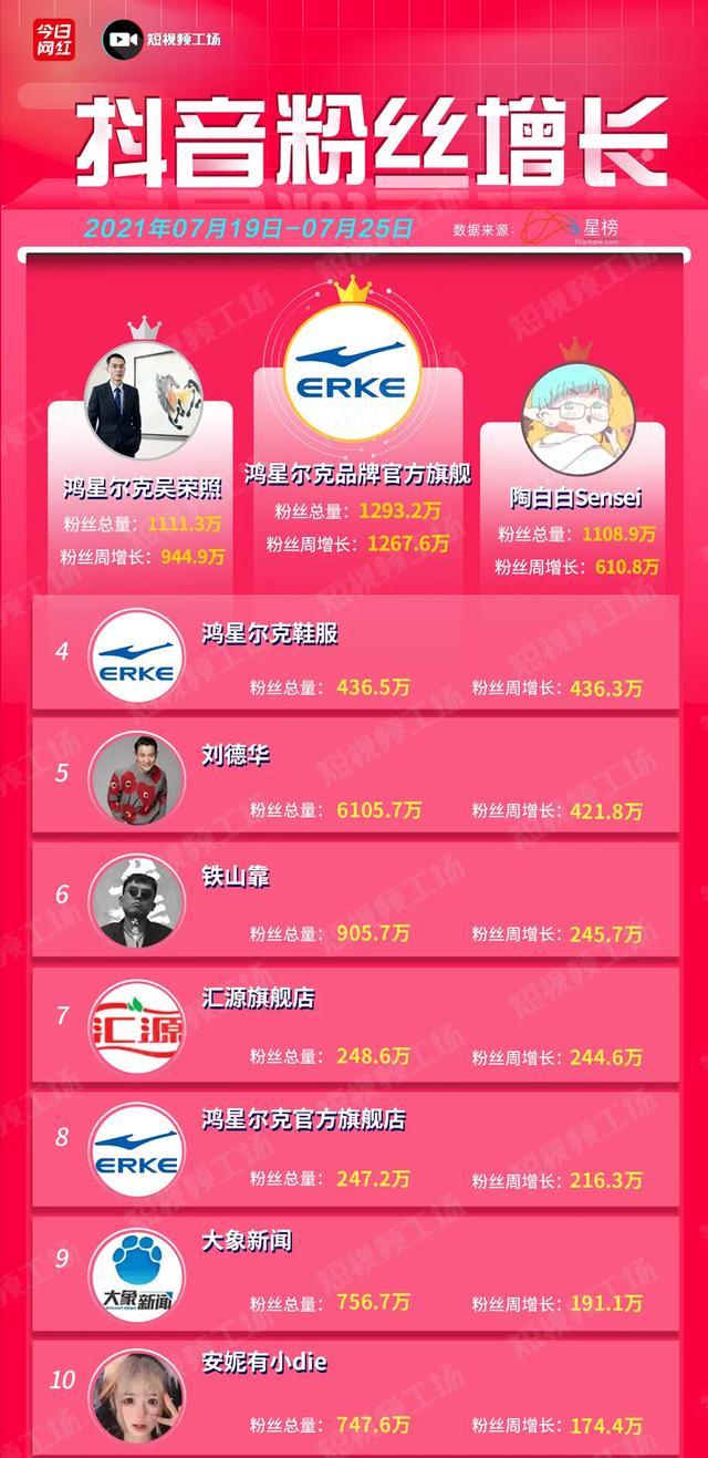 涨粉数据方面,品牌账号“鸿星尔克品牌官方旗舰”周涨粉1268万夺冠;“奥运赛事”凭借涨粉150万登顶快手榜第一。视频数据方面,明星刘德华发布祝福河南平安视频,排名本期抖音视频榜冠军。