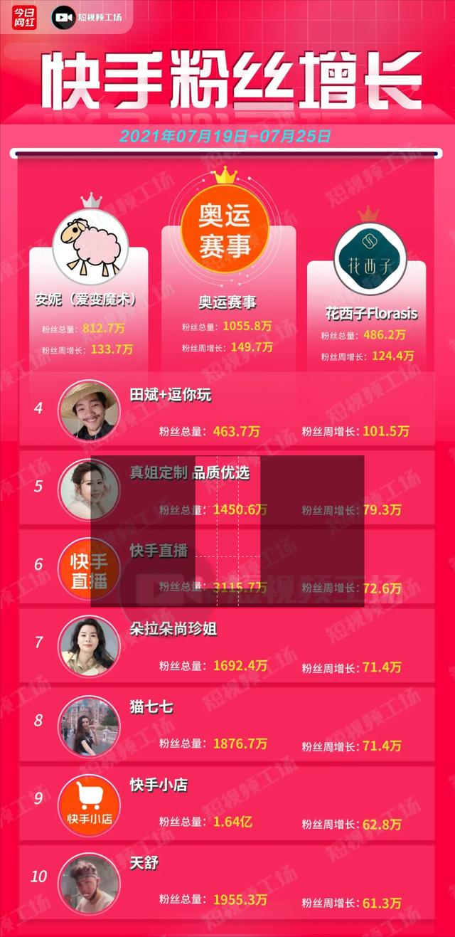 本期快手榜仅有4位达人涨粉超百万,达人入榜门槛升至61万,涨粉速度缓慢上升。