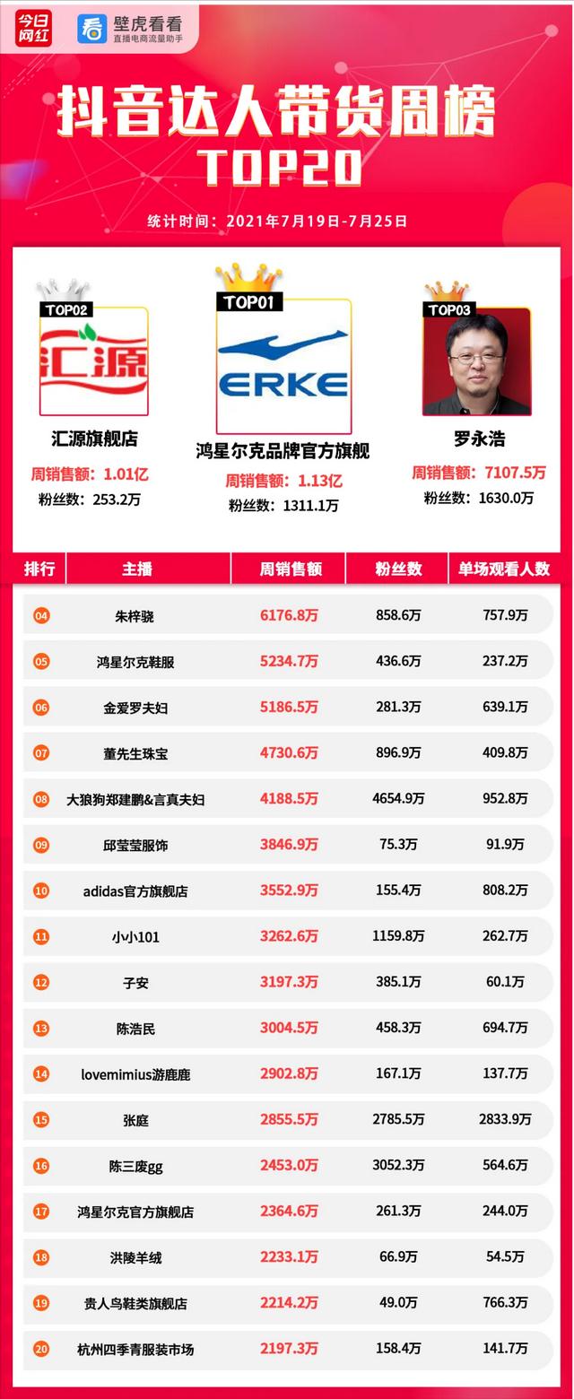 本周(2021.07.19-07.25)行业数据出炉,共分为带货数据、机构流水(直播)和短视频榜单三部分。