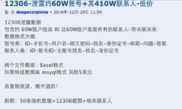 据悉,12月28日下午,据国内互联网安全新媒体Freebuf爆料铁路购票平台12306疑似发生数据泄露,有一份包括60万账户信息、410万联系人数据的文件正在被贩卖中,从文件截图来看,被贩卖的信息包含了用户ID、手机号、密码,姓名、身份证、邮箱、验证问题及答案等诸多个人隐私信息。而这份文件的标价仅为20美元。