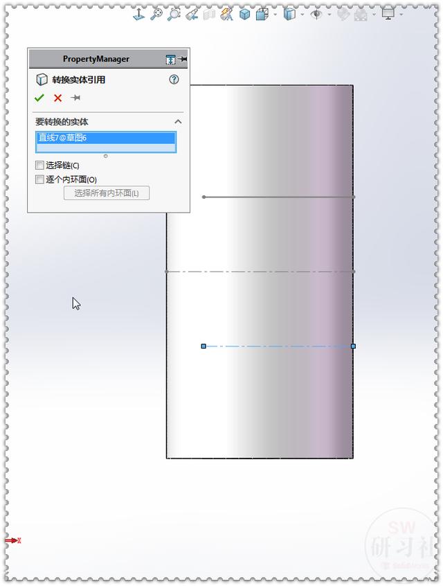 7.【上视基准面】【转换实体引用】直线。(这两根直线是切口草图)