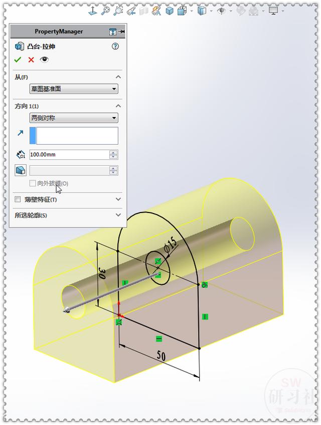 2.【拉伸凸台】两侧对称:100 。