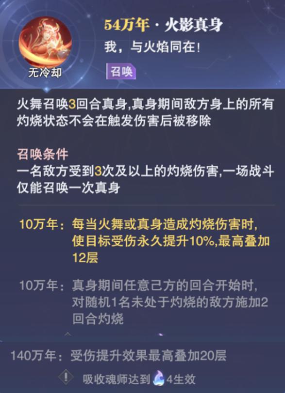 然后火舞真身的技能是对单体造成伤害,且可以直接触发目标的4-6次【灼烧】伤害,靠着这个效果火舞真身的增伤效果也可以更快的达成,此外当这个真身技能处于cd中时,火舞还可以花费1-3点魂力来刷新此技能的cd效果,这也更加保证了火舞真身的增伤效果可以提升到120%-200%的上限水准。