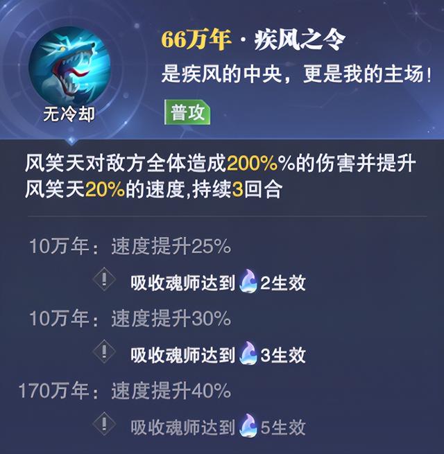 然后是风笑天真身技能,其效果是对敌方全体造成一定伤害,且根据对方速度的差距会有额外的增伤,最高可以达到420%的增伤幅度,效果还是比较不错的,另外此技能还有一个重要的价值便是当风笑天为全场速度最快,风笑天和真身的所有主动技能都将刷新cd,这也意味着风笑天和真身是可以一直不断的使用技能的,这也能让其在长图打伤害副本中的强度得到质变般的提升。
