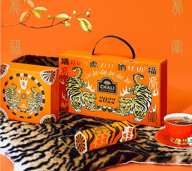 在即将到来的2022中国新年,CHALI茶里推出了新年瑞虎礼盒,寓意瑞虎纳福、年年富足。礼盒内包含10款人气茶包,冻干果茶两袋,两根阿萨姆棒棒奶茶。与普通的礼盒不同,包装配色没有一味搞中国红,两只夸张的“鞭炮盒”勾起儿时过年放鞭炮的记忆。趣味十足的日历转盘形式和风俗年画的视觉观感把老虎身上那股子傲气传达得淋漓尽致。
