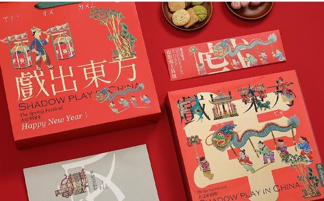 礼盒中皮影戏元素的融入把中国特色与现代审美展现得淋漓尽致。从春节主题过年舞龙狮、八仙过海入手结合皮影绘画以及皮影演艺的创作手法。将发展千年的优雅的技艺重新回归大众的身边,赏戏当然配糕点,音乐入耳。观众在戏楼一边认真听戏一边品尝着糕点,传统年节回归到当下生活,让中国人过传统中国节。