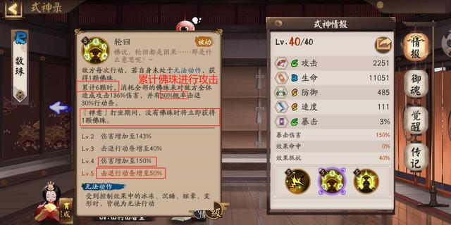 接着来看数珠的被动,这是一个攻击加推条的技能,当敌方任一式神行动的时候,只要数珠没有处于无法行动的状态,就可以积攒一颗"佛珠",当佛珠累计到六颗的时候,数珠就会给对面一个单段AOE伤害。敌方将受到攻击150%的伤害,并且有30%的概率击退50%的行动条,这里的概率不受效果命中影响,不用为了推条效果而去堆命中。如果大招在释放之前数珠还没有"佛珠",那么可以立刻获得一颗"佛珠"。