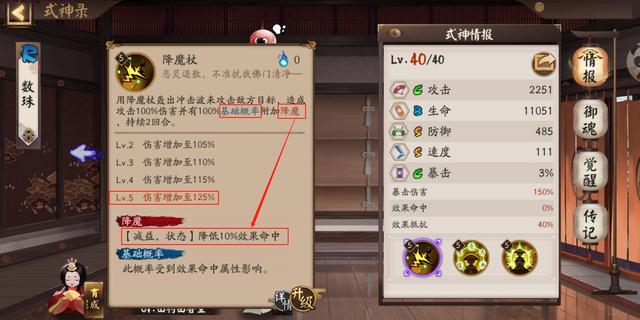 首先来看数珠的普攻技能,攻击敌方目标造成攻击125%的伤害,并且有100%的基础概率给目标附加"降魔"debuff,可以减少目标10%的效果命中。这个普攻明显是针对敌方的控制式神,该buff可以叠加,但是buff只存在两个回合,就算数珠跑条再快也叠不了很厚的buff,普攻的降低效果命中技能并不是特别实用,而且命中和抵抗这种属性本身就是靠概率来触发的,很难稳定,这个buff的意义并不是很大。