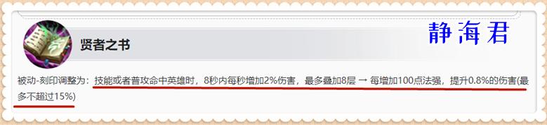 - 从原先的必须技能和普攻命中英雄才能开始叠加伤害→每增加100点法术攻击力就能提升0.8%伤害(不超过15%)。