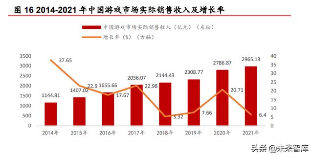 (1)手游市场依靠上述优势迅速增长。根据《2021 年中国 游戏产业报告》,中国游戏市场规模达到 2965.13 亿元,其中移动 游戏占据国内游戏市场主流,总收入占比为 76.06%,达到 2255.38 亿元。