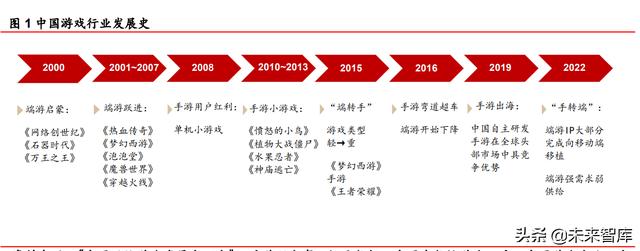 中国网络游戏行业自 2000 年起,经历了高速发展的 8 年。期 间,孕育了《传奇》《梦幻西游》《魔兽世界》等持续保持强大影 响力与生命力的端游作品。国内游戏公司早期通过代理海外研发 的游戏产品实现业绩增长、强化品牌影响力,后期逐步开展自主 研发业务,推出自研游戏产品。2008 年起,智能手机的普及使手 游迎来用户红利。手游行业发展前期,单机小游戏占主体;中 期,海外手游如《愤怒的小鸟》《植物大战僵尸》《水果忍者》等 表现亮眼,国内手游则以《捕鱼达人》《天天爱消除》《天天酷 跑》等为代表开始起步,匹配用户红利,端游仍占国内游戏行业 主体地位;后期,经典端游 IP 移植手游,游戏类型由轻向重,“端 转手”成为趋势。