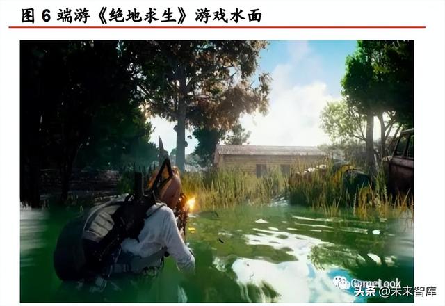 手机硬件设备的限制一定程度上限制了手游的设计空间,从 而影响了游戏内容的质量和深度。即使游戏基础玩法不会受到影 响,但优质的视觉感受能使玩家获得更强的游戏享受。以《绝地 求生:刺激战场》移动端为例,虽然其还原了《绝地求生》PC 端 的大部分大地图、建模、游戏场景和经典风格,但画质细节方面 与 PC 端依然存在差距。通过对比《绝地求生》PC 端与移动端的 游戏体验,我们认为:端游的画面细节设计更为精细,现实感 强,而手游则偏向于较为平面的简化卡通风。以水面设计为例, 端游中的水面颜色会根据水深展现不同层次,手游中水面颜色则 为统一颜色,减弱了水面的真实感。再者是局部细节的画面渲 染,端游的树木和草丛密集度高,人行道立体感、做旧程度接近 于现实,而手游贴图化的细节使得游戏体验有所下降。