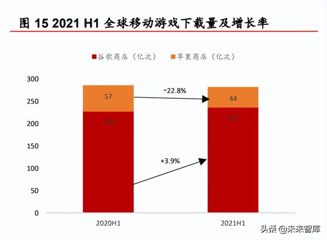 根据行业情报数据机构 SensorTower 统计,2021 年上半年玩 家在苹果、谷歌商店总游戏花费就达到了 649 亿美元,而其中手 游消费占据了游戏总收入约七成,达到了 447 亿美元。2021 年上 半年手游总支出同比增长 24.8%,其中苹果商店收入达到 260 亿 美元,同比增长 13.5%;谷歌商店收入达到 187 亿美元,同比增 长 24.7%。