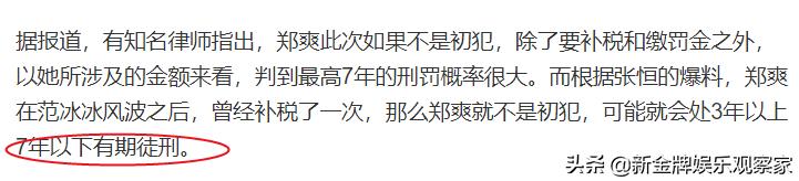 这还不算,张恒的爆料信息量很大,比如他说,范冰冰出事后,郑爽去补了一次税。如果是这样额话,郑爽就不是初犯。这次就麻烦了。律师说了,按照一般情况,除了要补税和缴罚金之外,以她所涉及的金额来看,判到最高7年的刑罚概率很大。