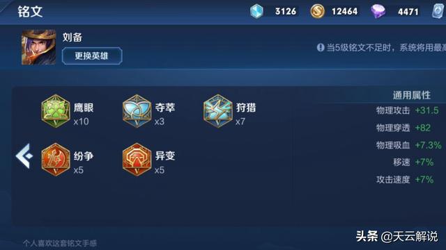 这样的铭文配备能够比较好的发挥刘备这个英雄的特点与优势,+31.5物理攻击,+82物理穿透,+7.3%物理吸血,+7%移速,+7%攻击速度。