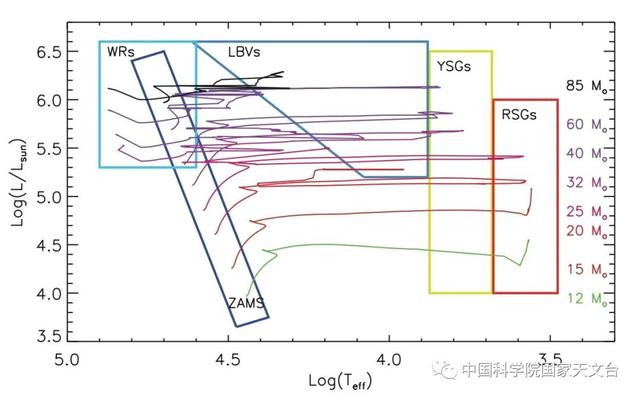 图4. 大质量恒星的Geneva演化轨迹(图源:Ekstrom et al. 2012)