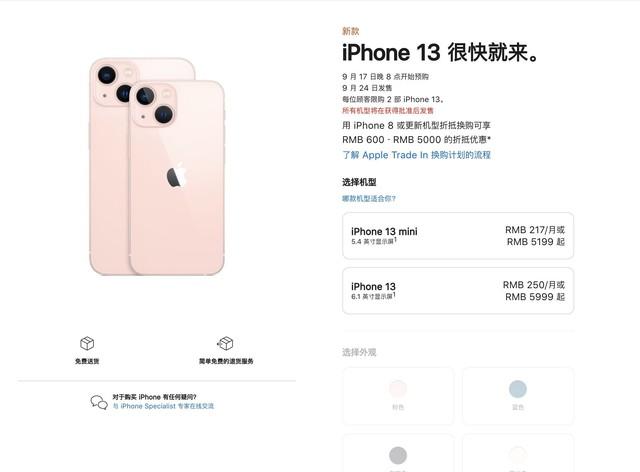 iPhone 13 mini起售价:5199元;iPhone 13起售价:5999元。