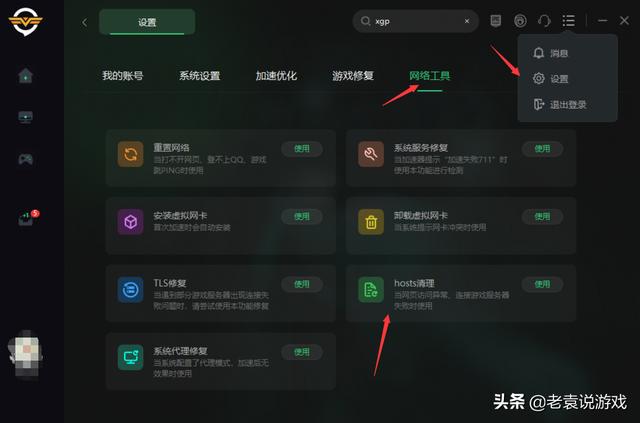 一般情况下,玩家的电脑经常性的会出现hosts文件被污染的情况,这个时候玩家可以对hosts文件进行修复。可直接打开奇游右上角的【设置】页面,即可看到如下图所示的【网络工具】页面下的hosts清理,点击使用即可快速完成修复。